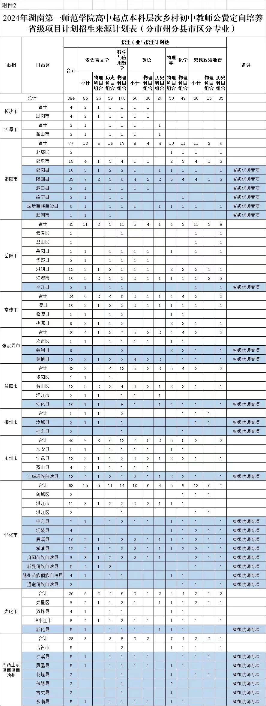 (二)本科层次初中教师公费定向培养招生计划:384人,其中省级优师专项200人。(详见附件2)