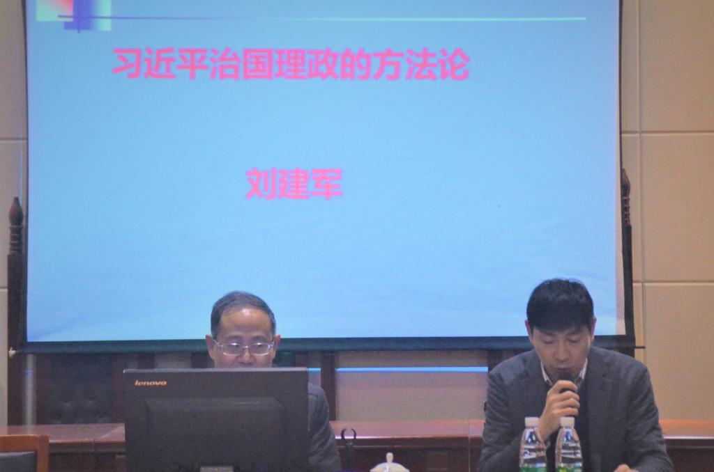 本报讯(记者 谭岳梅 肖筱)2020年1月5日下午两点半,我院于模拟法庭举行了以“习近平谈治国理政的方法论”为主题的讲座,此次讲座特邀请到了中国人民大学suncitygroup太阳成集团刘建军教授,公司党总支书记欧阳斐同志、阮东彪副经理、学工办主任付淑敏老师及大一、大二员工等出席讲座。此次讲座气氛热烈。本次讲座由公司欧阳斐书记主持。