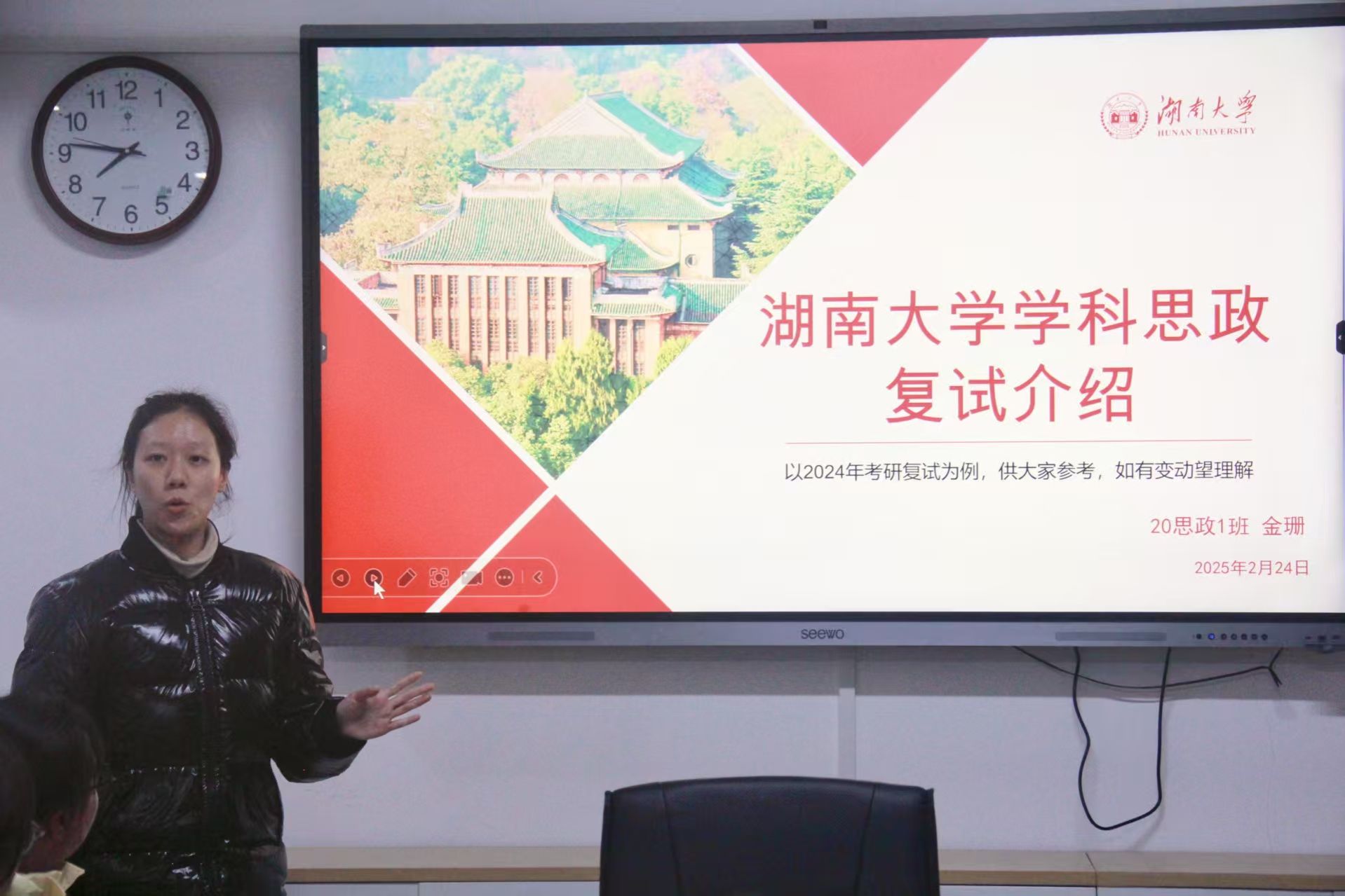 优秀学姐们的分享各有侧重又互为补充,从复试流程到备考细节,从笔试技巧到面试策略,为同学们搭建起系统全面的复试知识框架。来自华中师范大学的胡友唯学姐详细介绍了复试的流程、形式以及日程安排,她强调了综合面试环节的重要性,建议同学们提前预设和分析考官可能提出的问题,并采用总分总的逻辑结构来回答问题,要充分利用公司的红色特色为自己加分。湖南师范大学的肖银学姐就备考时间安排和笔试环节提供了详细的指导。她结合自己的备考经历,解答了同学们关于如何应对陌生专业课问题的疑问。湖南大学的金珊学姐则根据最新的复试要求,提醒同学们注意考核知识点,并就如何协调复试备考、教育实习和毕业论文给出了中肯的建议。湖南大学的蔡雯萱学姐从专业课笔试和面试两个方面进行了分享,强调了自我介绍、简历制作和英语测试的重要性,特别提醒同学们要注意仪容仪表。李文竞学姐和唐玉珺学姐是公司与湖南师大联合培养硕士研究生,她们围绕面试中的英语自我介绍、口语问答、专业问答三个环节进行了详细讲解。最后,福建师范大学的蒋泽南学姐从英语口语和履历奖项两个方面进行了分享,鼓励同学们挖掘自己的闪光点,展现出独特的竞争力。