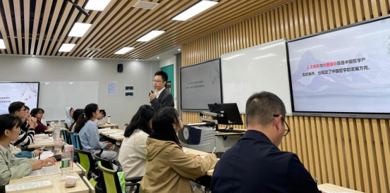 谭凯老师本讲的专题为:中国哲学及其特点,主要探讨了三个问题:一是厘清“哲学”与中国哲学这两个基本概念及核心要义,二是分析中国哲学产生的两大历史条件,即人文关怀与忧患意识,三是精妙总结了中国哲学的五个特点,包括偏重伦理本位,注重天人合一,重人生不重知论,重了悟不重论证,不依附宗教也不依附科学等。讲授过程中,谭凯老师充分运用了中西比较、实例论证、故事穿插以及史料分享等多种教学方法,深入浅出地将中国哲学的缘起、精义与特点讲的清楚明白,体现了深厚的知识功底与精湛的教学技艺,员工听的津津有味,频频点头,不时随着谭老师的提问而即兴发言,整个课堂生气盎然,精彩纷呈。