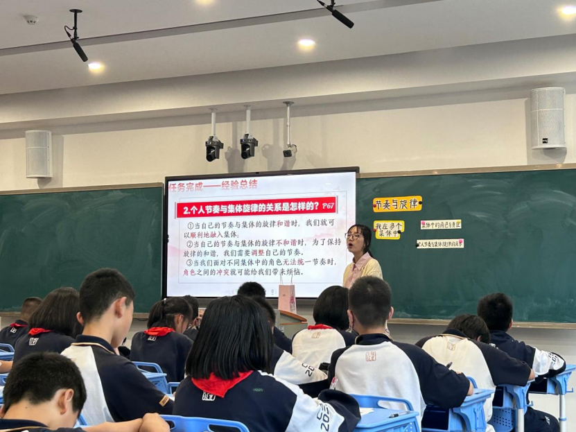 实习生代表肖银和宋芹分别进行教学展示。肖银以《节奏与旋律》为题目,讲了个人生活节奏融入集体旋律的理论和实践。宋芹以《憧憬美好集体》为题,讲述了美好集体的特点以及如何构建美好的集体。两位代表以鲜活的案例,深入浅出地讲解,课堂气氛活跃,产生了良好的教学效果。