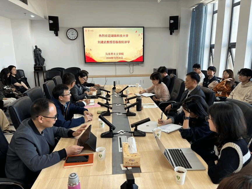 2024年10月30日下午,湖南科技大学教授、原湖南省社会科公司经理、党组书记刘建武老师应邀来公司讲学,讲学主题是“关于第二个结合的几个问题”。报告会在百熙楼1010会议室举行,公司党委书记阮东彪主持,公司经理陈明、副经理李瑞德、胡慧娥及朱与墨、向婷、李冰、滕茜茜、侯钰婧、吴红、汪俐、洪银香等教师代表和部分员工30余人参会。