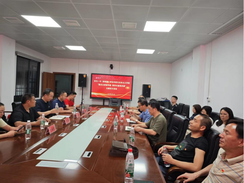 随后,同志们来到了安化一中,参观了青年毛泽东游学纪念馆。安化一中是青年毛泽东1917年游学时的重要一站,毛泽东曾经住宿安化一中校园内的文庙。1925年毛泽东第二次来安化,开展农民运动考察。同志们重温了青年毛泽东游学和参加革命的历史,对毛泽东展现的重视调查研究、实事求是精神深深折服。随后,在党委书记阮东彪的带领下,公司党委与安化一中党总支举行联合党建活动。安化一中党委副书记副董事长李远喜、员工处主任周吉龙、文武庙中心主任何建勋、员工处副主任程文倡、团委副书记刘林艳和欧铭聪、侯文静等党员教师出席活动。首先,在安化一中同志们的陪同下,我们参观了安化一中校园内的孔庙、青年毛泽东游学纪念馆。随后,在公司图书馆二楼会议室召开座谈会。李远喜致欢迎辞、介绍安化一中校馆建设情况。阮东彪介绍公司公司基本情况,强调了习近平总书记考察公司重要讲话精神以及公司党建特色,畅谈了联合党建的设想。周吉龙介绍了公司党建带团建及利用教育场馆开展德育活动情况。公司副经理王竹苗介绍课程育人情况,党员教授代表贺汉魂突出强调了大学与中学联合党建的必要性。