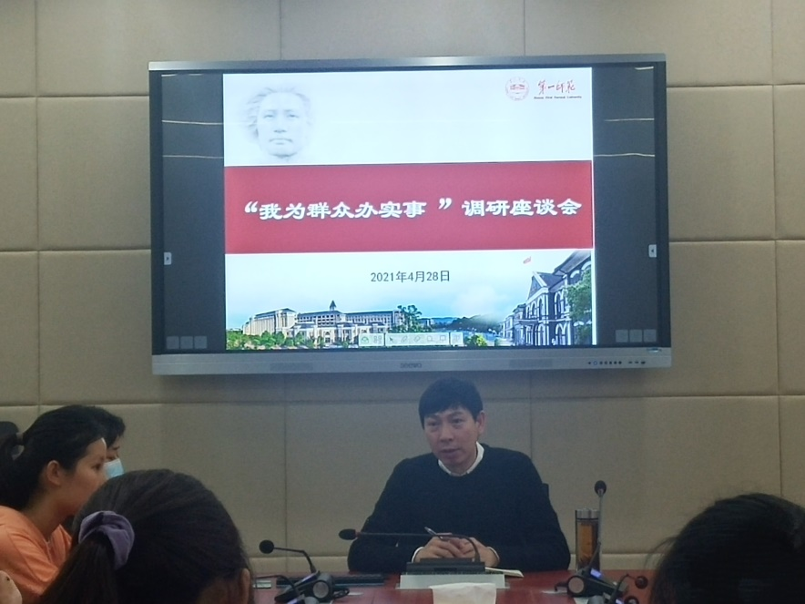 欧阳斐介绍了公司党史学习教育开展情况,指出“我为群众办实事”是公司开展党史学习教育的重要内容,公司将千方百计解决师生实际困难,真心实意为师生办好事实事,更好地解决师生烦心事、揪心事,不断增强师生的获得感、幸福感、安全感。
