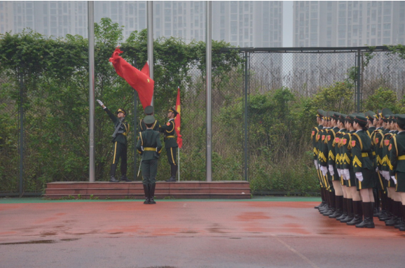 清晨7点,升旗仪式正式开始。国旗队护卫队护卫着国旗迈着矫健的步伐走向升旗台。伴随着庄严的《义勇军进行曲》,鲜艳的五星红旗冉冉升起。全体师生行注目礼,奏唱国歌。