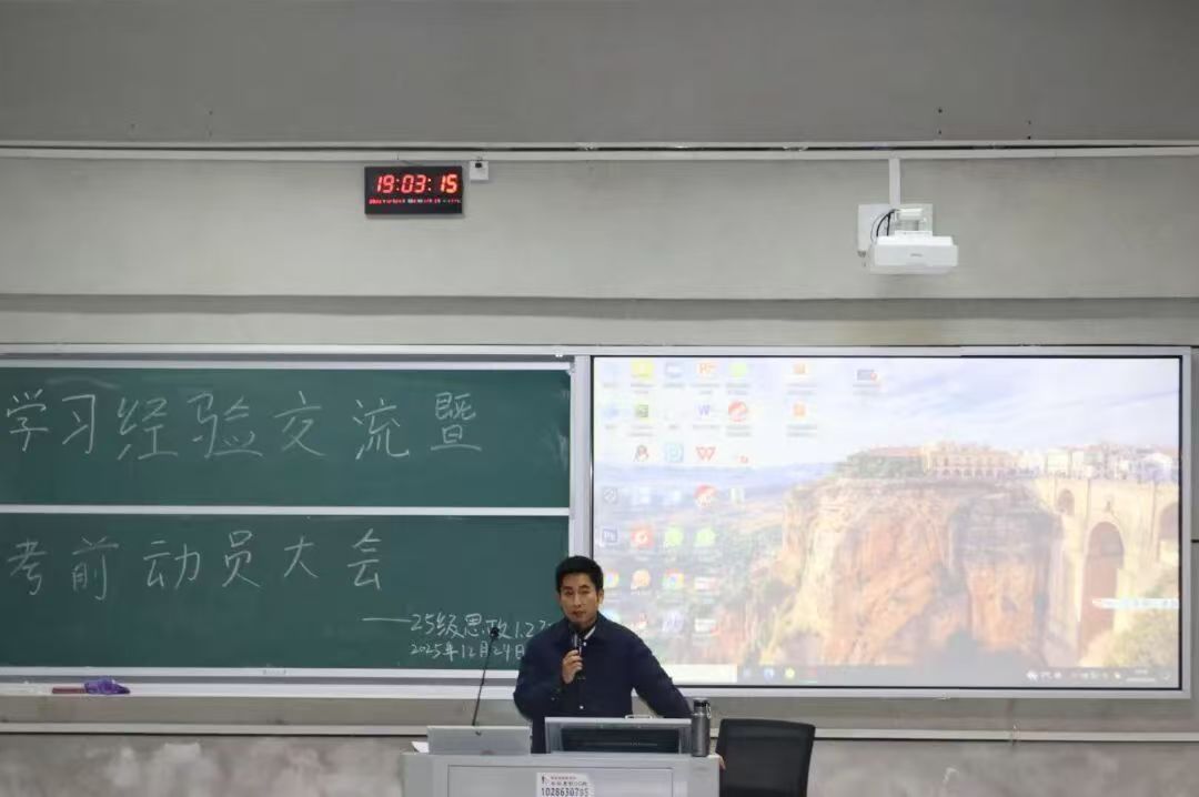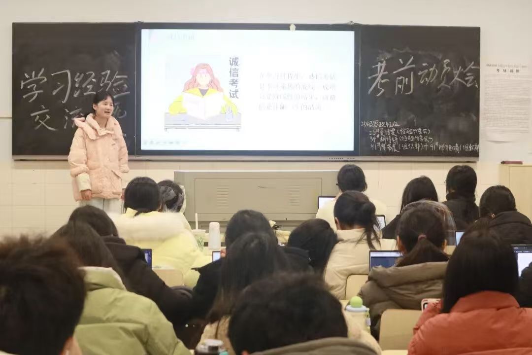 为了帮2025级新生理清备考思路,树立诚信考试的意识,12月24日晚上,suncitygroup太阳成集团在润寰楼和怀中楼教室召开了学习经验交流暨考前动员大会。本次大会覆盖25级所有员工,由学工办主任于澎主持,还特别邀请了李潇然、孙可嘉、杨紫娟、邵赫颖、汤佳雯五位优秀学长学姐到场分享经验。