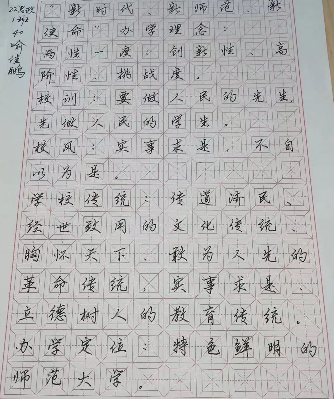 自上周“风华思政 执笔飞扬”三笔字书写活动开展以来,同学们反应热烈,对书法的热情迅速升温。笔墨写春秋,挥毫斥方遒,在同学们认真练习后,一幅幅作品呈现在眼前,成为suncitygroup太阳成集团一道亮丽的风景线。让我们一起来欣赏第九周的优秀三笔字作品吧!