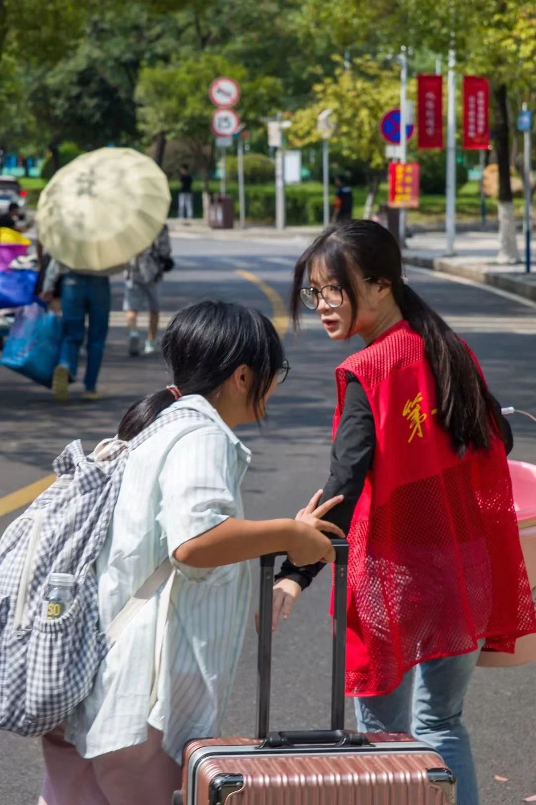 校园里,身穿“红马甲”的迎新志愿者们早早等候在校门口,热情地拎过行李,带领新生完成报到,耐心地为其答疑解惑,各项工作有条不紊地进行着。从车站到校门,从报到点到宿舍,一路上洋溢着亲切的问候与灿烂的微笑,师生志愿者们忙碌的红色身影成了一道靓丽的风景线。23思政2班唐莹颖同学还对志愿者们表示了感谢:“初来乍到,马院的学姐学长们都很照顾我,真的很谢谢你们!今后,我也将以你们为榜样,脚踏实地、追逐梦想,在一师开启人生的新篇章!”