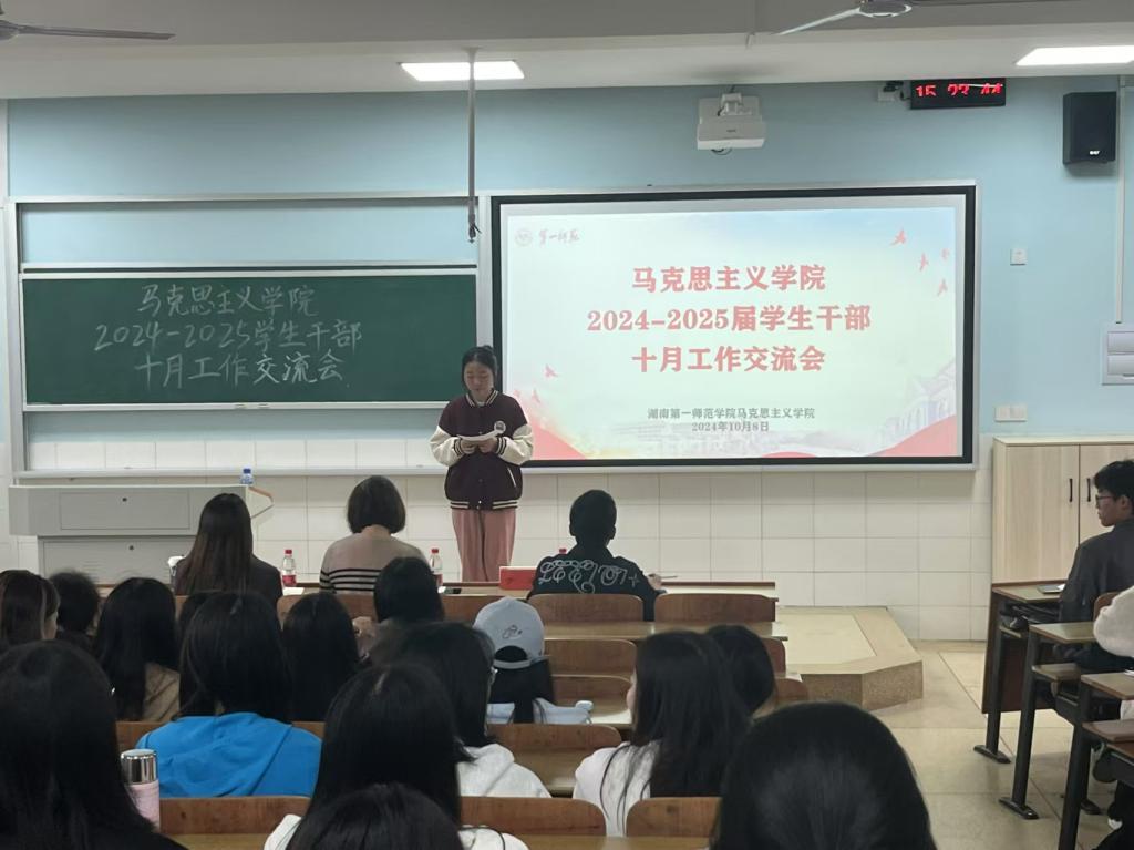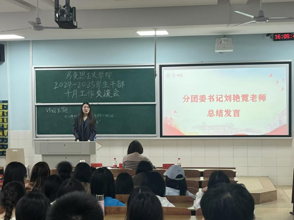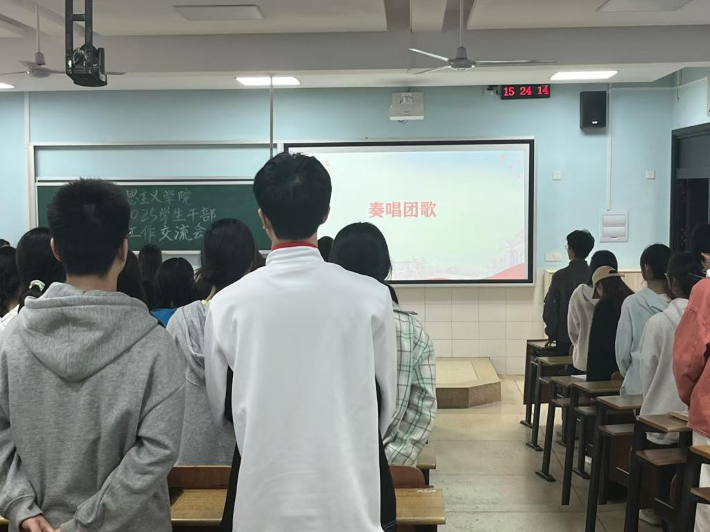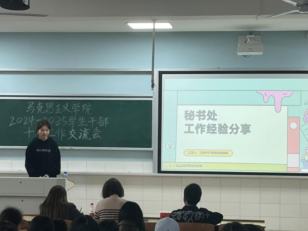 交流会伊始,与会人员齐唱团歌,随后秘书处负责人邹涵靓、团委办公室负责人胡卓尔和员工党务工作办公室负责人梁承鸿先后上台分享工作经验。邹涵靓同学从信息收集工作、素质能力分管理、值班表安排、德育考核四个方面详细介绍了秘书处的日常工作以及工作中的所思所想、改革创新。胡卓尔同学则回顾了团委办公室牵头开展的重点工作和她们的工作思路,她以撰写一则活动通知为例,指出通知其实是工作思路的体现,须准确且完整。梁承鸿同学围绕员工党支部如何开展“一月一课一片一实践”活动展开汇报,强调以“创新”凝聚人气、增强实效。
