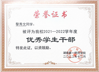 “学而不思则罔,思而不学则殆。”自大一入学起,黎秀文便以严格的自我要求锚定成长方向,秉持“人生万事须自为,跬步江山即寥廓”的信念,在学业道路上稳步前行。她始终坚持明确的目标导向,以扎实的知识储备筑牢发展根基,其专业成绩与综测排名逐年攀升,。在专注理论学习的同时,她还注重多维能力的拓展,积极考取专业技能证书,主动投身学科竞赛,将理论学习与实践应用有机结合起来。凭借着勤勉不辍的学习态度与锐意进取的拼搏精神,她荣获了国家励志奖学金、校三好员工、二等奖学金等荣誉。