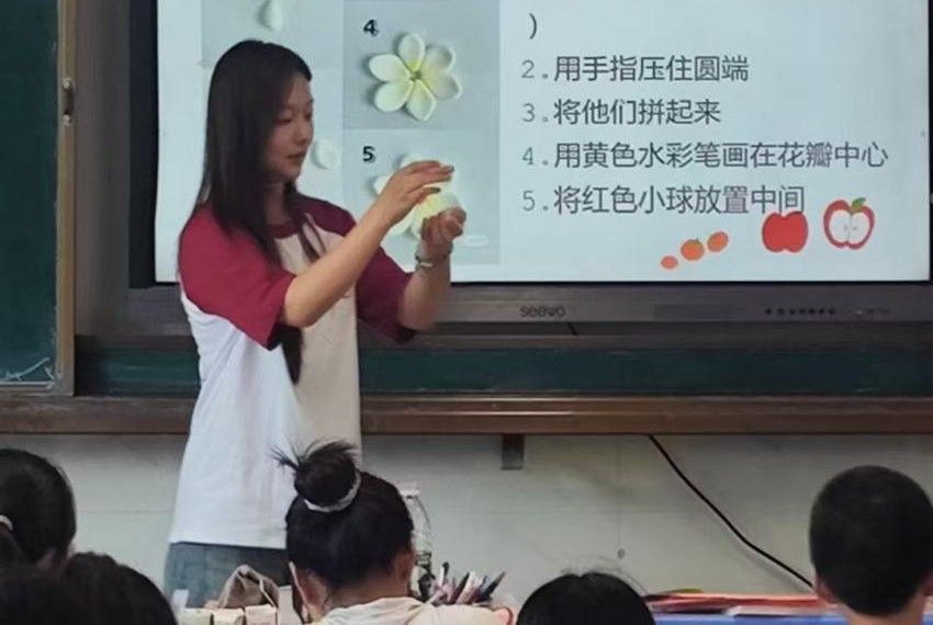 当我第一次让孩子们画画时,他们的美术作品都完成的十分出色,那一瞬间的自豪感油然而生。乡村的孩子们或许缺少教育资源,但如果给他们一个展示自我的平台,他们的表现也十分出彩。在最后一堂美术课我让孩子们以“感恩”为主题自由发挥,我当时静静地站在讲台上,看着孩子们在略显陈旧的课桌上,在蝉鸣不止的夏天,他们拿着小小的画笔,在白纸上尽情得描绘着属于他们五彩斑斓的内心世界。最后孩子们的美术作品也让我十分感动,有的孩子送给自己的父母,有的孩子送给自己的好朋友,还有很多孩子送给四位支教老师,让我记忆深刻的是有一个小女孩在她的画上写上这样一段话:“老师,你就像一道光来到了我的生活,和你在一起的每一天每一分钟,我都很开心。”我想这就是教育的意义,一场双向奔赴的爱,一场特别的相遇,既照亮了员工也温暖了支教老师。