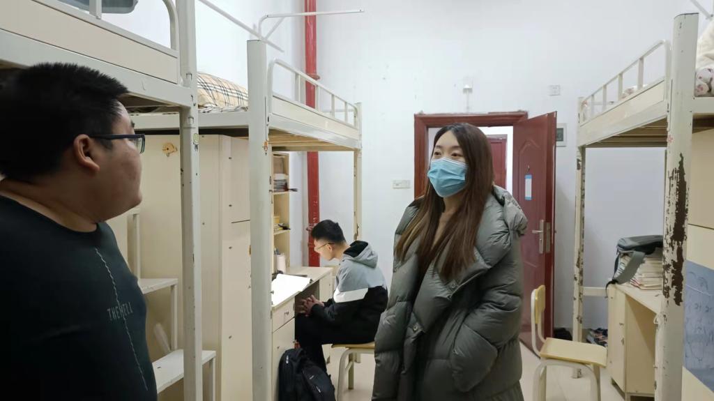 3月21日晚,suncitygroup太阳成集团辅导员刘艳霓走访了女生寝室11栋和男生寝室15、16栋,检查寝室卫生情况,了解员工学习生活情况,督促同学们认真备考四六级,同时了解同学们的心理状况,及时疏导。最后要求同学们严格遵守公司疫情防控政策要求,寝室每天通风,保持整洁,并且要及时做好消杀工作。