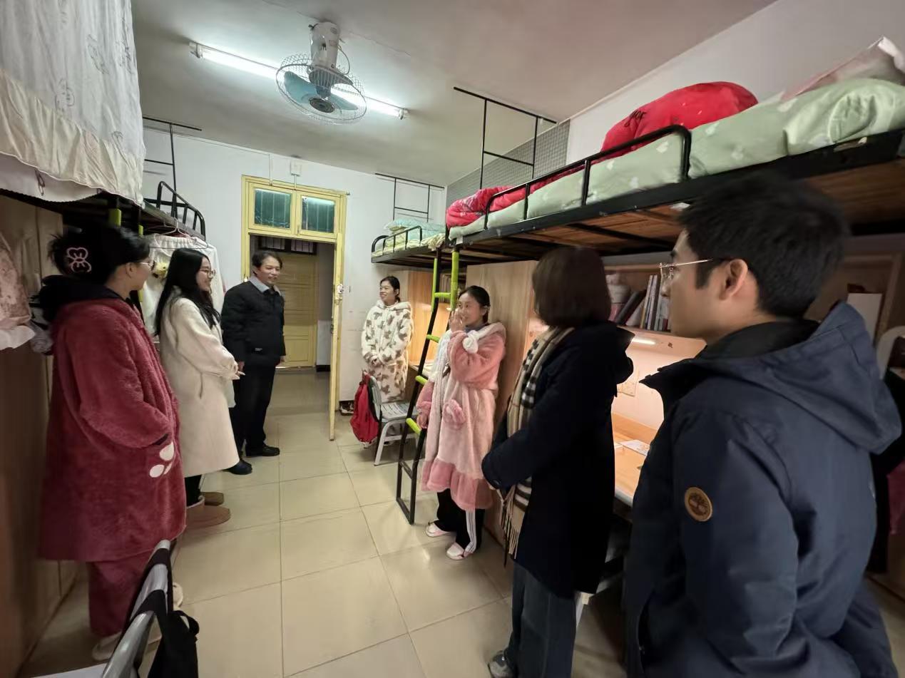 12月27日下午,马克思主义公司党委书记曾玉华、党委副书记胡英带领辅导员深入员工寝室,叮嘱同学们期末合理安排复习时间,同时也耐心提醒同学们,冬季要注意防寒保暖,要提高宿舍安全意识。严禁使用违规电器、大功率电器等,告知同学们未使用的插座等电器设备要及时断电。即查即改,避免事故发生,共同维护宿舍的安全与稳定。